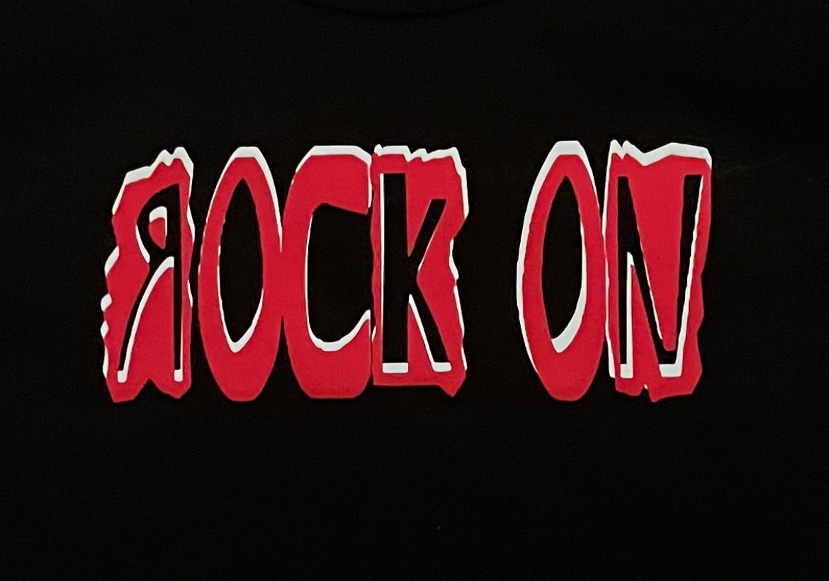 Fun ROck on destroyed & reversed logo design for babies toddlers kids and adults Black 100% cotton, red and black print. Black tee. Short sleeve, round neckline. Unisex. One of a kind. Hand printed. (Available in onesies & snapbacks hats by request)